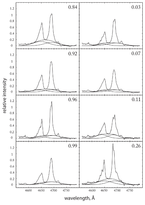 We have taken the spectra nightly twice a day, in Russia, and after 12 hours, in Hawaii. The same spectral region is shown in 8 spectra; two bright lines are seen in each: the line of ionized helium on the right, and the line on the left is the Bowen blend, which consists of 6 lines (3 lines of doubly ionized nitrogen and 3 lines of doubly ionized carbon). All these lines are formed in very hot gas with a temperature of 30-50 thousand degrees. Below the lines, broad contours are shown; these are the discovered super-broad components, one under the helium line, another one under the Bowen blend, and their sum. The numbers in each fragment indicate the orbital phase of the binary system. In the phases 0.92, 0.96, 0.99, 0.03, and 0.07, the supercritical accretion disk is eclipsed to an observer by the donor star. That is why these components are weak.