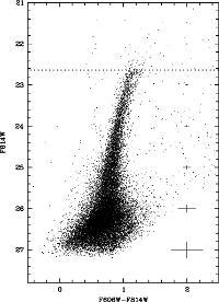 Fig.2. Colour-magnitude diagram of resolved stars in KKs 3. Photometric errors are indicated by the bars at the right side of the CMD. The tip of the red giant branch is indicated by the dotted line