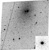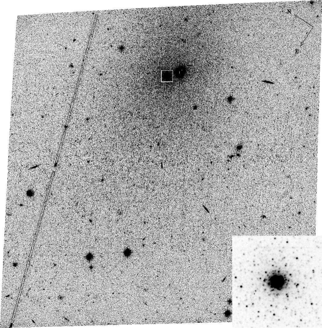 Fig.1. HST/ACS image of KKs 3 through the F606W filter. The image size is 3.4x3.4 arcmin. The 7.5 arcsec region highlighted by the white square near the centre of the galaxy is shown in the lower right corner to contain a globular cluster