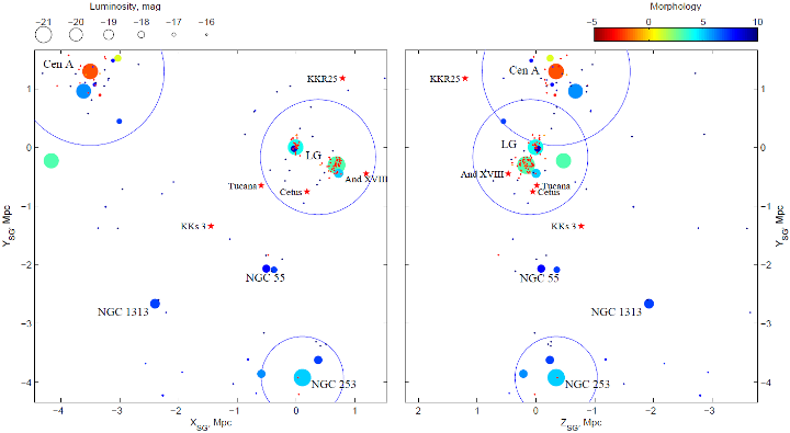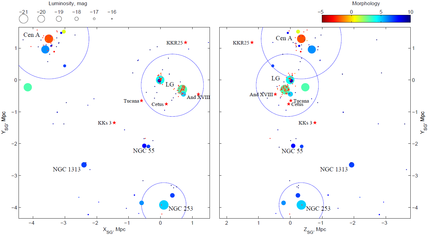 Fig.3. Landscape of neighbouring galaxies around KKs 3. The colour and size of the circles represent the morphological type and luminosity of a galaxy according to the given scales. Three circles outline spheres of zero-velocity surfaces around the three massive groups: the Local Group and groups around NGC5128 (CenA) and NGC253. Red stars locate five dSph galaxies that in varying degrees are isolated systems