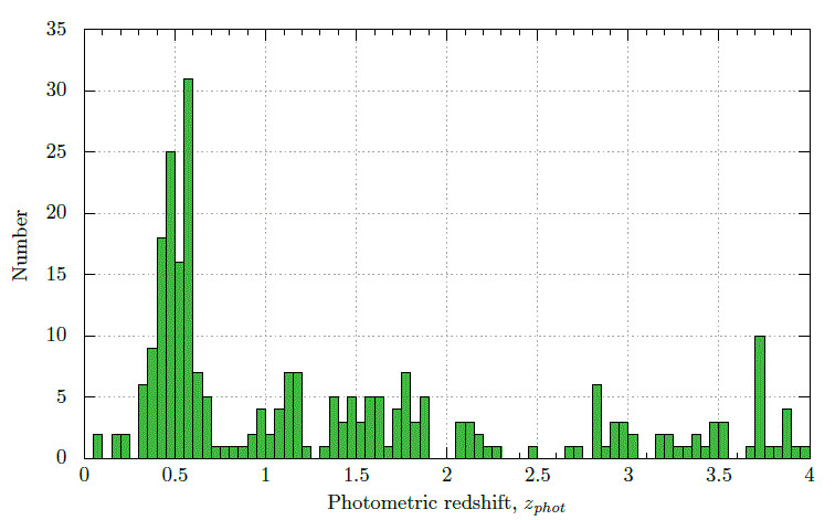 3.The clustering of galaxies was detected in a larger area (∼3×3 sq. degrees) around GRB 021004 position with the effective peak near z≈0.56 (fig. 3), detectable from distributions of spectral and photometric z with the use of new catalogs of galaxy clusters based on data of the Sloan Digital Sky Survey III and also its part, the Baryon Oscillation Spectroscopic Survey.