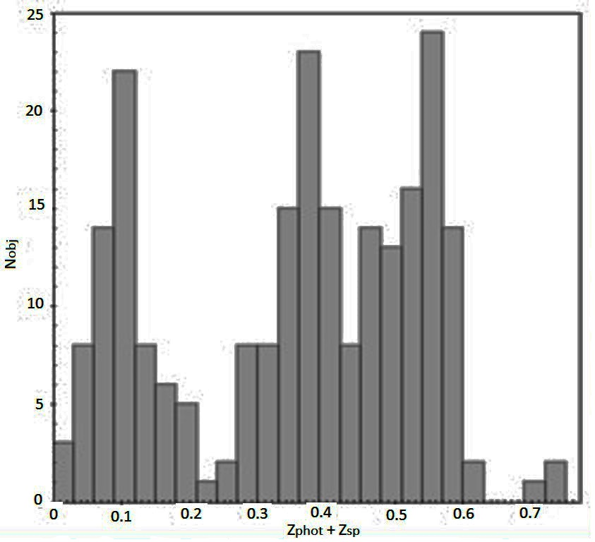 4.From data of 6 catalogs (with the depth in r<21.5 st.magn. for photometric and B<23 st.magn. for spectral redshifts z) the size of the whole inhomogeneity in distribution of galaxy clusters – a supercluster with a peak near z≈0.56, was estimated as ∼7°±1°.