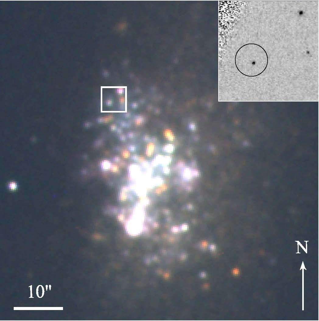 Figure 1. Superposition of B, V, and Rc images of the UGC 6456 galaxy taken with BTA/SCORPIO. The inset shows the HST/WFPC2/F555W image of the region around UGC6456 ULX marked by the square; the circle indicate the 0.8" 90%-error box of the ULX position derived from the Chandra data. |
