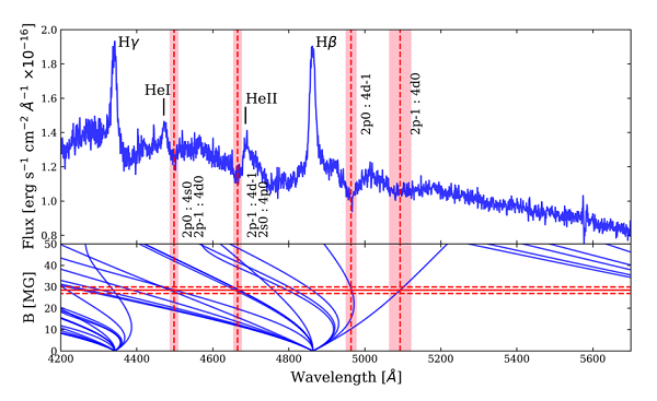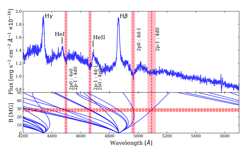 Kolbin A.I., Suslikov M.V., Kochkina V.Yu., Borisov N.V., Burenkov A.N., Oparin D.V. (SAO RAS) Polars are close binaries consisting of an accreting magnetic white dwarf (hereinafter referred to as a WD) and a cool donor star (usually an M dwarf). The strong magnetic field of a WD (10-100 MG) makes these systems synchronous, i.e., leads to equality of the WD rotation period Pspin and the orbital period Porb. However, among the polars, there is a small group of asynchronous polars (8 systems with candidates are known) exhibiting asynchrony <3%. The nature of the asynchrony remains unclear, but it has been suggested that it may be due to the recent Nova explosion. Our work has supplemented the list of asynchronous polars with the system SDSS J085414.02+390537.3. We discovered its asynchrony from the analysis of ZTF photometry, in which different periods Porb and Pspin are distinguished as well as the beat period Pbeat (1/Pbeat = 1/Porb - 1/Pspin). The corresponding polar asynchrony is 0.3%. The system shows signs of a change in the main accreting pole, which are difficult to detect in previously known systems. The spectra of the polar obtained at the BTA telescope with the SCORPIO-1 and -2 instruments demonstrate Zeeman splitting of hydrogen lines and cyclotron harmonics, the modeling of which gives an estimate of the WD magnetic field B = 28-34 MG. The work was supported by the grant of the Russian Science Foundation № 22-72-10064.