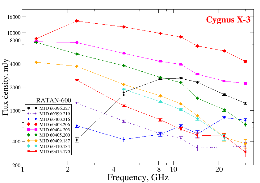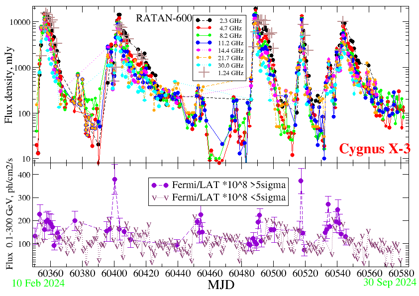 In 2024, during multi-frequency (1-30 GHz) monitoring with the RATAN-600 radio telescope, we detected five giant (with a flux of above 10 Jy) flares from the XRBS Cyg X-3. Such activity of the object is quite rare, if not unique. For example, no any flares were detected in 2021-2023. The onset of all five flares was clearly associated with the detection of significant gamma-ray radiation at 0.1-300 GeV (the data from the Fermi space observatory). On the other hand, all the flares occurred during transition of the system from the hyper-soft X-ray state to the hard state, i.e., when the flux of hard X-ray radiation (15-50 keV) strongly increased from almost zero, and a flux of soft radiation of 4-10 keV (the data from the Japanese MAXI X-ray monitor on the board the ISS) decreased. We explain this behavior in the framework of a physical picture with a changing and (as was recently found by Veledina et al., 2024) supercritical rate of matter accretion onto the black hole, variations in the state of the corona and the accretion disk, and changes in the collimation process of jet emissions. Although, the radio flares evolved on different time scales from 10 to 60 days, they had similar properties: at first, the flux grew linearly with time, and the radio emission was optically thick at frequencies below 2 GHz, then after the maximum of the flare, there was an exponential attenuation with a gradual “softening” of the spectrum (the spectral index varied from -0.1 to -0.9 at high frequencies). In Fig. 1, from the Gamma-ray and radio light curves of Cyg X-3, it can be clearly seen that the gamma radiation correlates with the onset of radio flares, and the delay is less than one day. Figure 2 shows the spectra of the flare onset in March-April with a characteristic dip at frequencies below 3 GHz, probably due to either synchrotron self-absorption or thermal electrons in the jets. All flares were studied in a new multi-azimuthal mode at the “Southern sector with a flat reflector” antenna system at RATAN-600 of SAO RAS at two frequencies of 4.7 and 8.2 GHz. For the first time, it was possible to detect and study the spectral and temporal variability of Cyg X-3 at times from 9 to 300 minutes.