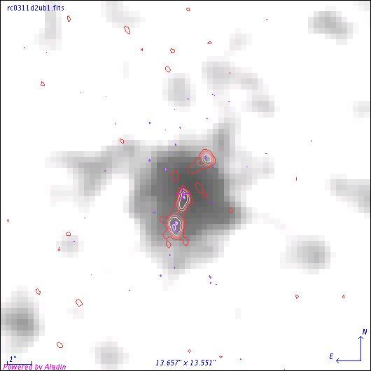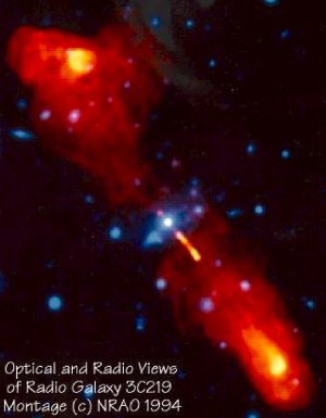 Fig.1. A double radio galaxy 3C219. A blue object in the middle is an optical radio galaxy. Red shows the radio source components.