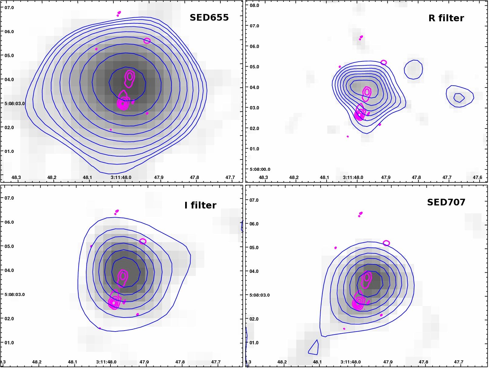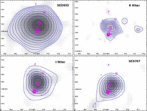 Fig.4. Isophots (blue lines) of RCJ0311+0507 images, obtained on BTA+SCORPIO in two wide band (R, I) and two narrow (SED655, SED707) filters with radio images superimposed (pink lines).