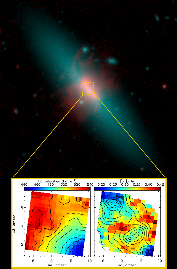Для нее приведено поле скоростей ионизованного газа (слева) и карта
