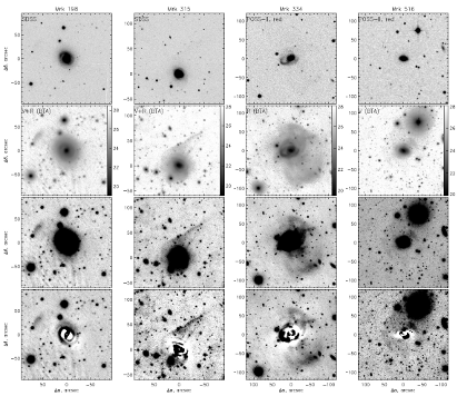 Рис.1. Сверху вниз: изображения из цифрового обзора неба; глубокие изображения, полученные на 6-м телескопе САО РАН, в шкале звездных величин и в линейной шкале, и остаточные изображения после вычитания симметричной модели распределения поверхностной яркости.
