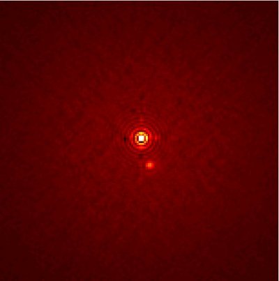 HD 64486 (слева), фильтр 800/100нм, Δm=3.43±0.02mag, ρ=0".350±0.002, <Be>=855±513Гс и HD 103498 (справа), фильтр 800/100нм, Δm=1.81±0.02mag, ρ=0".138±0.001, <Be>=333±138Гс. Кольца вокруг центральных компонент и пятнистая структура полей являются артефактами восстановления изображений.