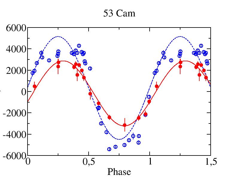 Рис.1. На рисунке изображены кривые переменности продольной компоненты поля Ве с фазой периода вращения для звезды 53 Cam. Видно, что величина поля, измеренного по ядру водородной линии (красные точки) и амплитуда его перемнности значительно ниже, чем измеренного по линиям металлов (синие точки).