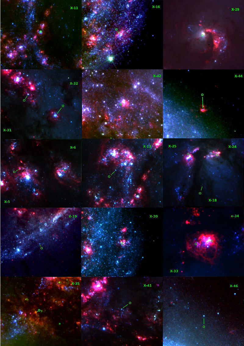 Рис.2. Фрагменты частей галактик Антенны (космический телескоп им. Хаббла), содержащих самые яркие рентгеновские источники (зеленые кружки) и скопления звезд. Палочками, там где это не очевидно, указаны родительские скопления объектов ULX. Диаметр кружков составляет 0.4"