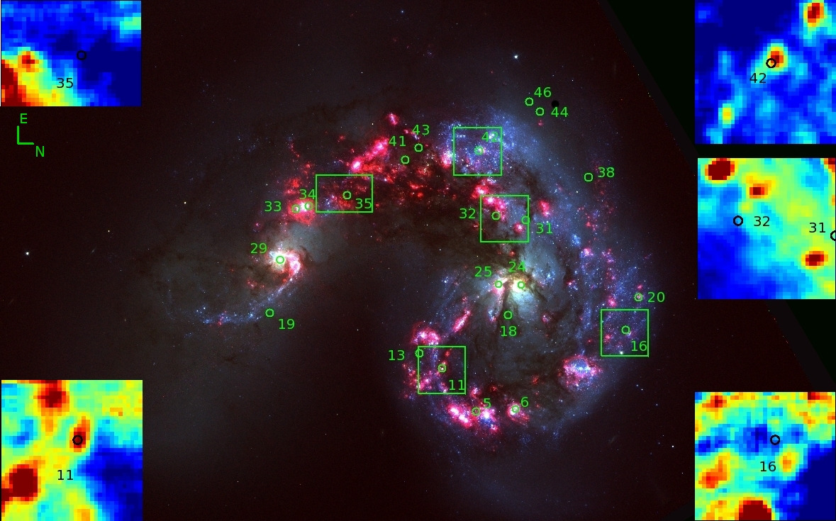 Рис.1. Изображение сталкивающихся галактик Антенны, полученное на космическом телескопе им. Хаббла. Яркие белые образования - ядра двух сливающихся галактик. Зеленые кружки с номерами показывают положения ярчайших рентгеновских источников. Зеленые прямоугольники - поля панорамного спектрографа VIMOS телескопа Melipal VLT. Эти же поля показаны на врезках по краям, положения ультраярких рентгеновских источников обозначены на них черными кружками