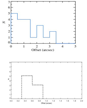 Рис.3. Распредение расстояний между ярчайшими рентгеновскими источниками в секундах дуги и молодыми скоплениями звезд в галактиках Антенны (сверху) и NGC3256 (снизу). В Антеннах 1 секунда соответствует 100 пк, в NGC3256 1 секунда равна 180пк
