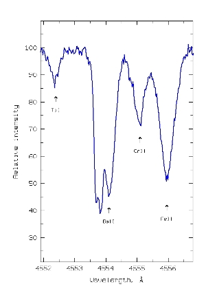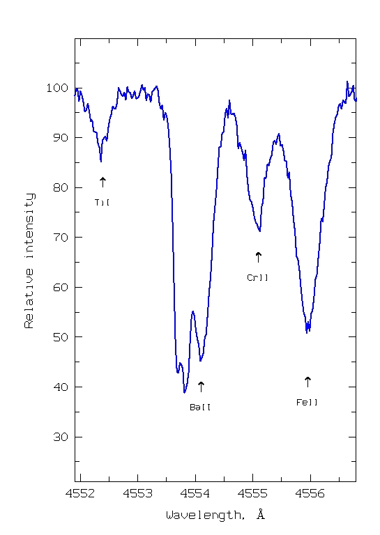 Рис.3. Расщепленная на 3 компоненты линия BaII 4554 Å в спектре V5112Sgr. Линия FeII 4556 Å, имеющая близкую интенсивности, не расщеплена.