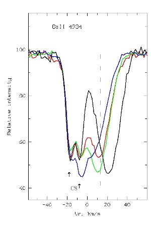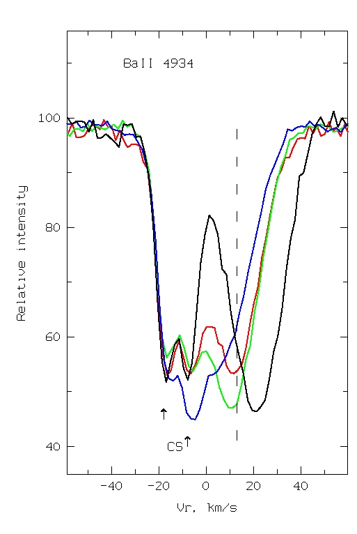 Рис.4. Переменность профиля расщепленной линии BaII 4934 Å в спектре V5112Sgr. Вертикальными стрелками указаны оболочечные компоненты. Штриховой линией отмечена системная скорость.