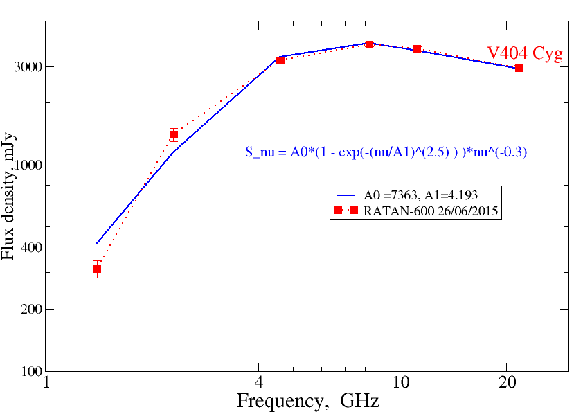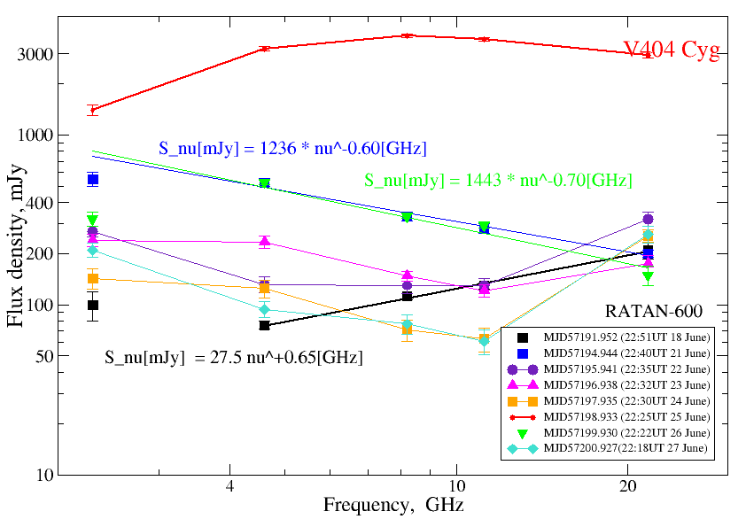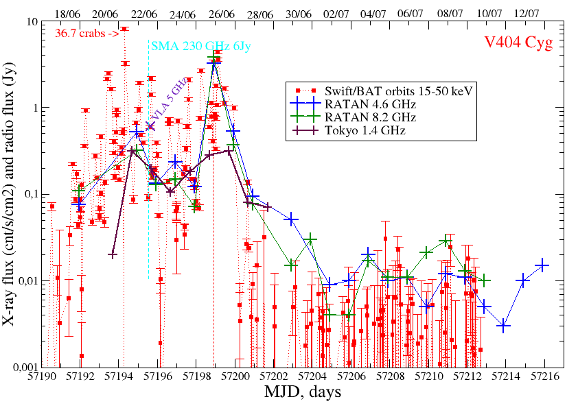 С 18 июня по 12 июля 2015 года мы ежедневно регистрировали радиоизлучение на пяти частотах 2.3, 4.6, 8.5, 11.2 и 21.7ГГц с помощью радиотелескопа РАТАН-600. Многочастотные измерения не проводил не один другой радиотелескоп в мире. К сожалению, РСДБ-наблюдения были выполнены не во время максимальной радиояркости и не выявили протяженную структуру объекта. Измеренные потоки в начале активного периода изменялись от 50 до 500мЯн, причем спектральный индекс синхротронного излучения варьировался день ото дня от +0.65 до -0.8. 26 июня, спустя несколько часов после яркого рентгеновского всплеска, радиопоток V404 Cyg вырос в 30-40 раз: от 0.05Ян в предыдущий день до почти 4Ян, что в несколько раз превышает максимальный уровень потока вспышки 1989 года. Надо заметить, что уровень 4Ян является очень высоким для подобного рода объектов и тем более для радиозвезд. Только в микроквазаре Cyg X-3 происходят вспышки выше 4Ян (максимум - около 25Ян). Спектр этой рекордной радиовспышки соответствовал оптически тонкому синхротронному излучению на частотах выше 4ГГц (спектральный индекс -0.3) и оптически толстому синхротронному излучению в самопоглощении (спектральный индекс -2.5) на более низких частотах. Вероятно, мы зарегистрировали самое начало формирования релятивистского струйного выброса вещества из полюсов аккреционного диска вокруг черной дыры. Спустя 14 дней радиопоток упал ниже уровня обнаружения на РАТАН-600 синхронно с падением рентгеновского потока.