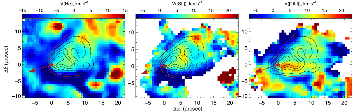 Показаны поля лучевых скоростей в эмиссионных линиях ионизованного