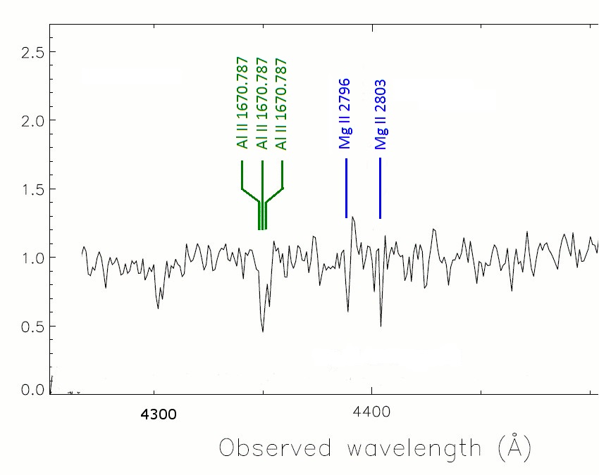 2. Абсорбционный дублет Mg II 2796/2803Å (рис. 2) с красным смещением z=0.56 найден в VLT/UVES-спектрах