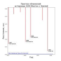 Наименьшее расстояние до Фаэтона составит около 10.3 миллионов километров, или 0.069 астрономической единицы (одна астрономическая единица - это среднее расстояние между Землей и Солнцем). Для сравнения среднее расстояние до Луны - менее 0.4 миллиона километров. Однако подобные сближения достаточно редки. Два следующих, сопоставимых по расстояниям, произойдут в 2050 и 2060 годах. Ближе Фаэтон окажется к Земле только в 2093 году, когда расстояние до него составит примерно 3 миллиона километров.