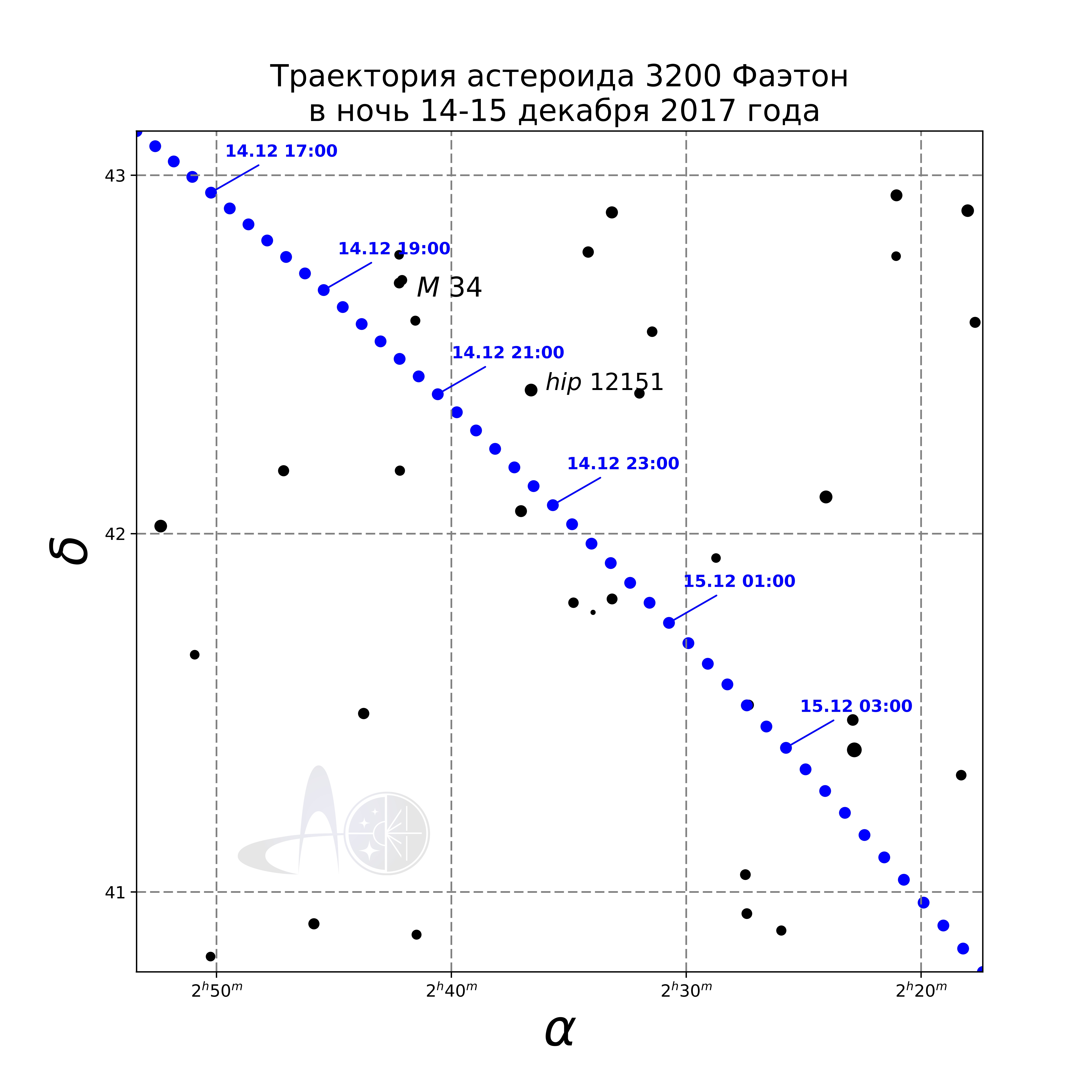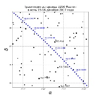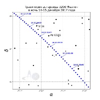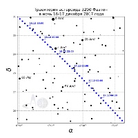 Рис.2,3,4 - Траектория астероида Фаэтон в ночи с 14, 15 и 16 декабря 2017 года. Указано московское время. Расчетное положение может меняться в зависимости от местоположения наблюдателя до нескольких угловых минут.