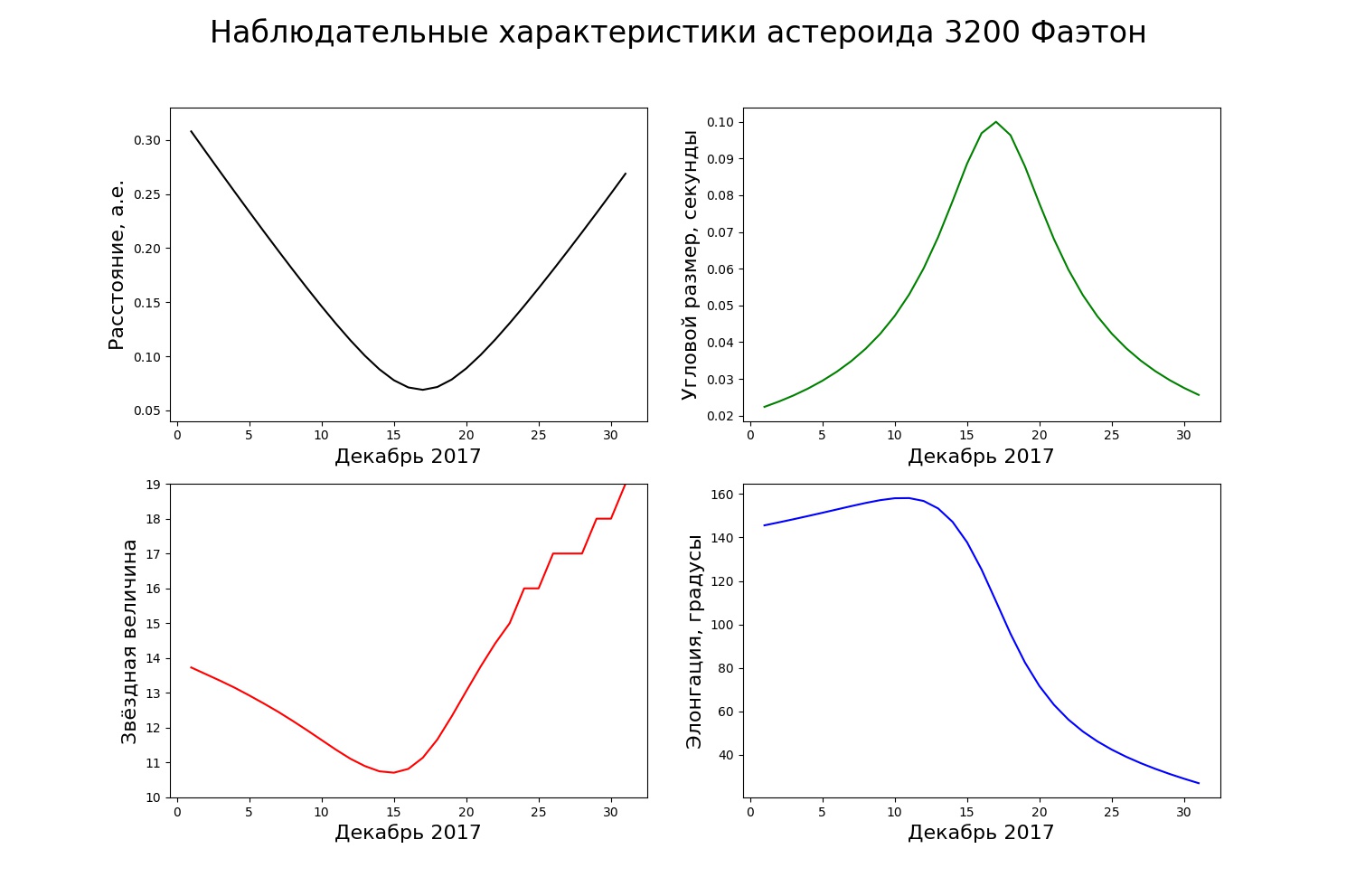 Сближение астероида с Землей будет продолжаться до середины декабря 2017 года. В это время за счет уменьшения расстояния его звездная величина будет нарастать, достигнув максимума 14-15 декабря. На минимальное расстояние Земля и Фаэтон сблизятся в ночь с 16 на 17 декабря.