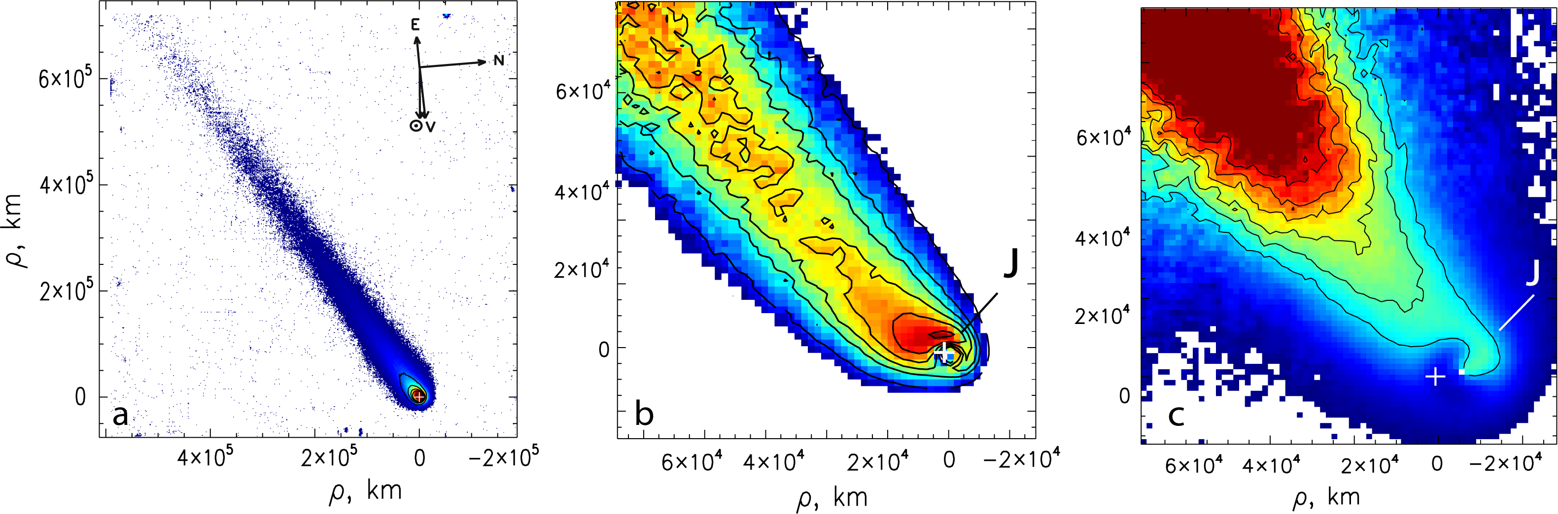 У кометы наблюдалась протяженная кома с сильно конденсированным веществом в околоядерной области и длинный хвост в антисолнечном направлении. После обработки цифровыми фильтрами суммарных изображений кометы, была выделена веерообразная структура (J) в солнечном направлении в коме кометы (Рис.1).