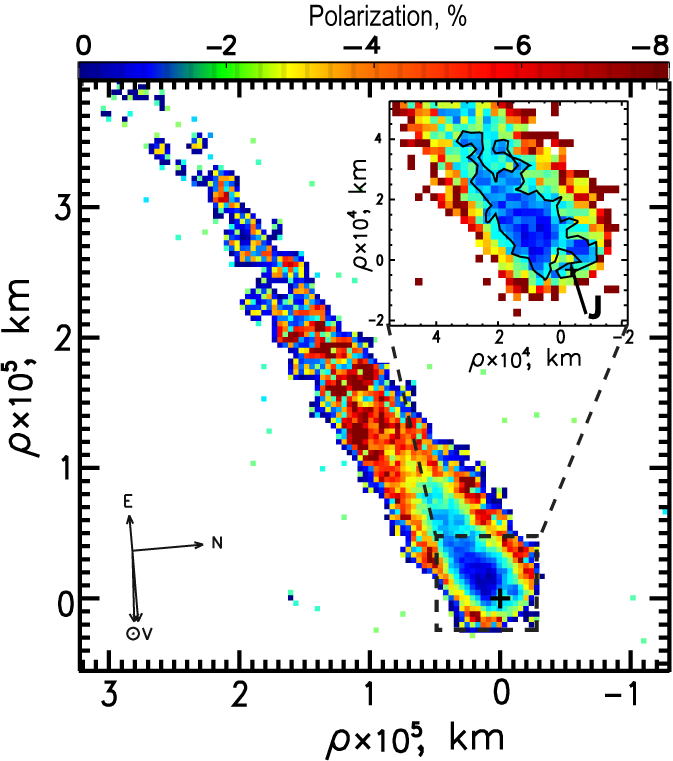 Анализ поляризации и цвета и их изменения с удалением от кометного ядра показал, что: (1) частицы пыли в далеких кометах малы (<1 мкм), что неудивительно, так как слишком мало газа, способного поднимать крупные частицы; (2) пыль содержит ледяные частицы и частицы, состоящие из (или покрытые) толина или аналогичных органических веществ; (3) присутствие фрагментов ледяных частиц около ядра.