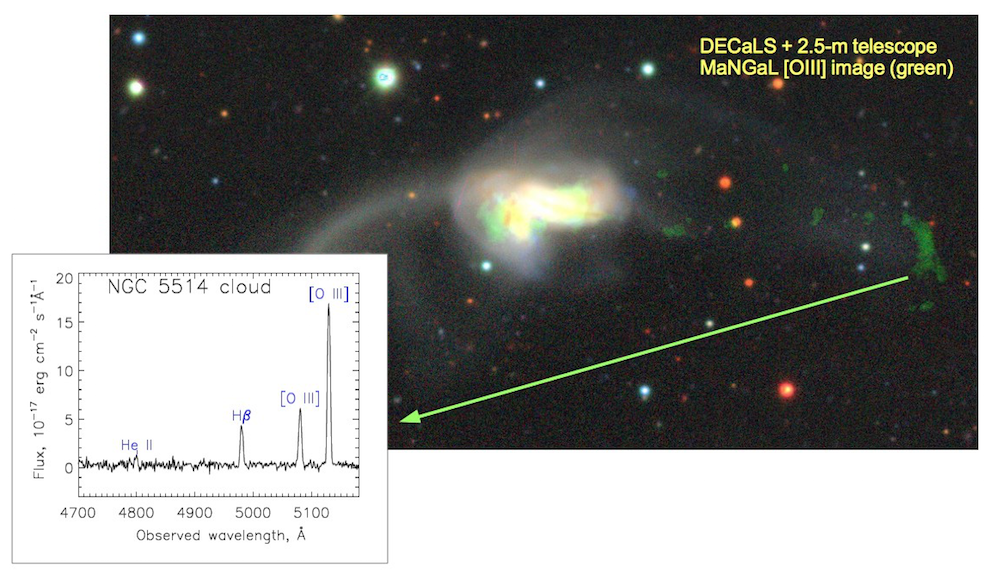 подсвечивает облака газа внутри галактики. На врезке - спектр облаков,