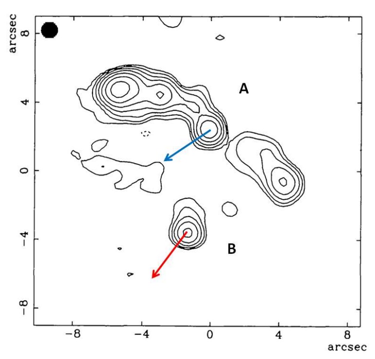 Рис.1. Ориентация векторов поляризации (цветные стрелки) компонентов А и В линзированного квазара Q0957+561, наложенная на композитное радиоизображение квазара.