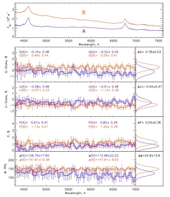 Рис.2. Спектры компонентов A и B (первая панель) и их параметры поляризации в зависимости от длины волны (панели 2-5): параметры Стокса Q и U, степень и угол поляризации для компонентов A (синий) и B (красный) квазара Q0957+561. Слева на панелях 2-5 показаны оценки для каждого параметра в диапазонах g-SDSS (слева) и r-SDSS (справа). Правые стороны 2-5 панелей показывают распределение параметров значения и их средняя разница для B-A.