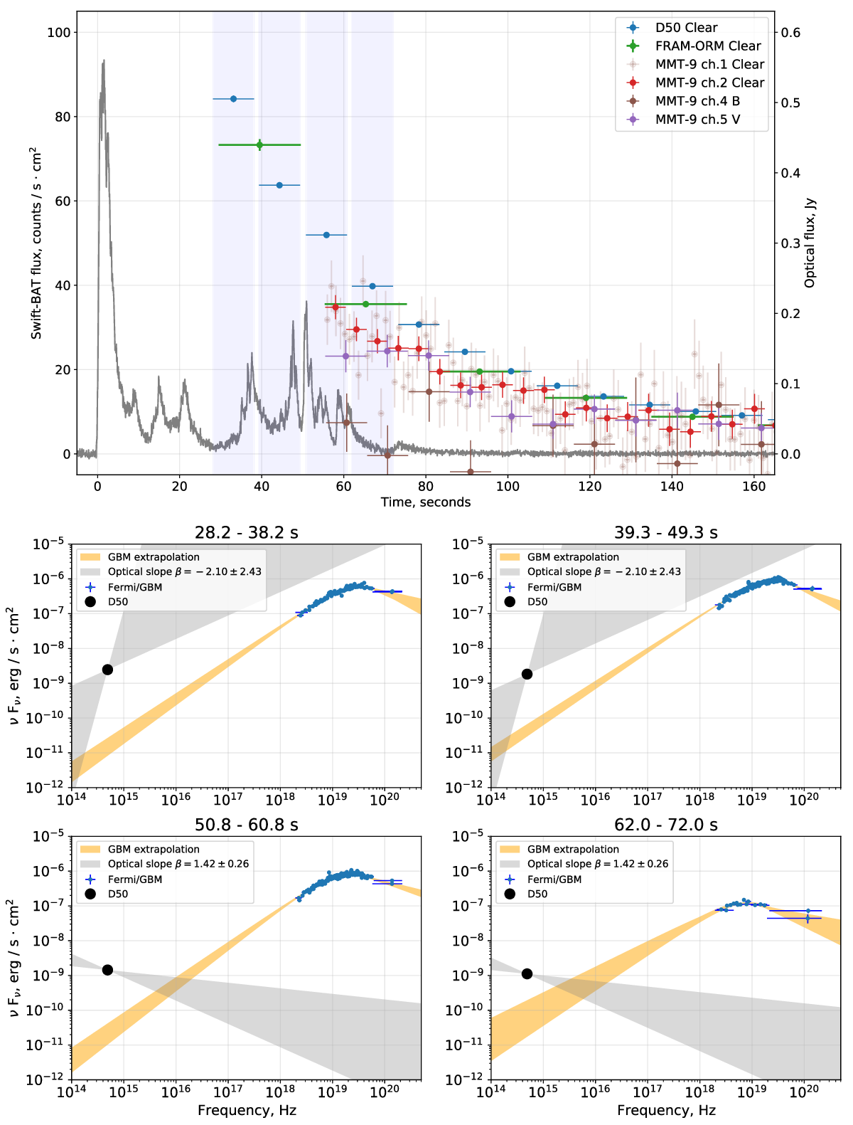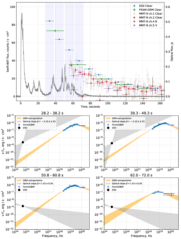 Оганесян Г., Карпов С., Бескин Г., Иванов Е., Перков А., Ляпсина Н. (САО РАН) в кооперации О. Салафия (INAF-OAB), М. Елинек (ASU CAS), С. Ронкини (GSSI), Б. Банерджи (GSSI), М. Бранчеси (GSSI), Я. Штробл (ASU CAS), К. Полячек (ASU CAS), Р. Худик (ASU CAS), Е. Каткова (АО НПК СПП), А. Бирюков (ГАИШ), В. Сасюк (КФУ), М. Мачек (CEICO), П. Янечек (CEICO), Я. Эбр (CEICO), Я. Юричек (CEICO), Р. Куннифф (CEICO), М. Проуза (CEICO) В ночь с 19 на 20 июня 2021 г. 9-канальная система Мини-МегаТОРТОРА (ММТ-9) обнаружила яркую (~10 зв. величины) оптическую вспышку, сопровождавшую один из самых мощных и далеких (на расстоянии 10 млрд св. лет) гамма-всплесков GRB 210619B. Ее излучение наблюдалось одновременно четырьмя объективами ММТ-9 с временным разрешением 1, 5, 10 и 30 секунд в белом и зеленом (V-полоса) свете. Несколько раньше это событие было зарегистрировано телескопами Чешской академии наук D50 (Ондрейов) и ФРАМ-ОРМ (Ла-Пальма) с временным разрешением 10 и 20 секунд соответственно. Высокое временное разрешение при наблюдениях ММТ-9 позволило сравнить тонкую временную структуру собственно гамма-всплеска GRB 210619B с его поведением в оптическом диапазоне. И если жесткое излучение имело форму набора вспышек секундной длительности, то такие детали в синхронной оптической кривой блеска достоверно отсутствовали, что впервые стало прямым свидетельством реализации во всплеске модели «обратного шока». Этот вывод был подкреплен и особенностями эволюции оптического спектра GRB 210619В, обнаруженными в процессе одновременной регистрации его излучения детекторами ММТ-9, D50 и ФРАМ-ОРМ в различных интервалах оптического диапазона. Уникальные данные, полученные в этом исследовании, сочетающиеся с результатами наблюдений гамма-телескопов Свифт и Ферми, на основании теоретического анализа, проведенного совместно с группой итальянских астрофизиков (GSSI, INFN, INAF, UNIMIB) позволили установить, что из 900 гамма-всплесков с оптическими компаньонами GRB 210619B однозначно связан с узким выбросом вещества при коллапсе массивной звезды, распространяющимся в очень разреженной межзвездной среде с почти световой скоростью, а его оптическое излучение обусловлено ударной волной, возникающей при столкновении этого выброса с межзвездным газом и движущейся в обратном направлении.