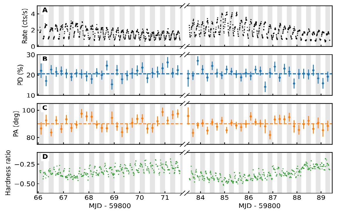 Рис. 1. Изменение во времени потока и поляризации для основного наблюдения IXPE. (А) Общая интенсивность в диапазоне энергий 2-8 кэВ, распределенная по временным интервалам в 500 с. Значения Параметра PD (B) и параметра PA (C) усредняются по одной орбите в соответствии с эфемеридами, определенным Черепащуком и др. Пунктирные горизонтальные линии представляют собой средние значения. (D) Коэффициент жесткости , определяемый как отношение разницы в скоростях счета IXPE в диапазонах энергий 4-8 и 2-4 кэВ к их сумме за 1000 секунд. Чередующиеся вертикальные полосы обозначают разные орбиты.