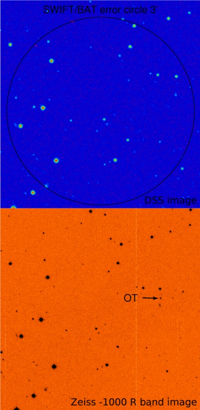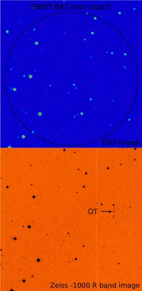 Рис.1. Вверху: DSS изображение области ошибок SWIFT/BAT (R фильтр). Внизу: прямой снимок, полученный на телескопе САО РАН Zeiss-1000 через полчаса после гамма-всплеска. Отмечено положение оптического транзиента GRB090726. |