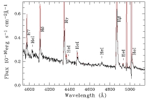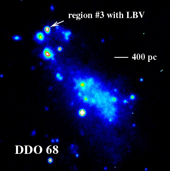 На рисунке сверху приведено изображение галактики DDO 68 (6-м телескоп), и стрелкой указана HII область No.3, в которой найдена LBV звезда. На рисунке снизу показан спектр (6-м телескоп) этой звезды на фоне излучения "туманности" (область HII, узкие линии красного цвета), в которую она погружена. Ветровые линии звезды намного более широкие, чем у туманности. Они также показывают абсорбционный компонент в синем крыле. Полный блеск области No.3 (звезда+туманность) за прошедший год увеличился в 1.5 раза, а блеск звезды - на 1.5m.